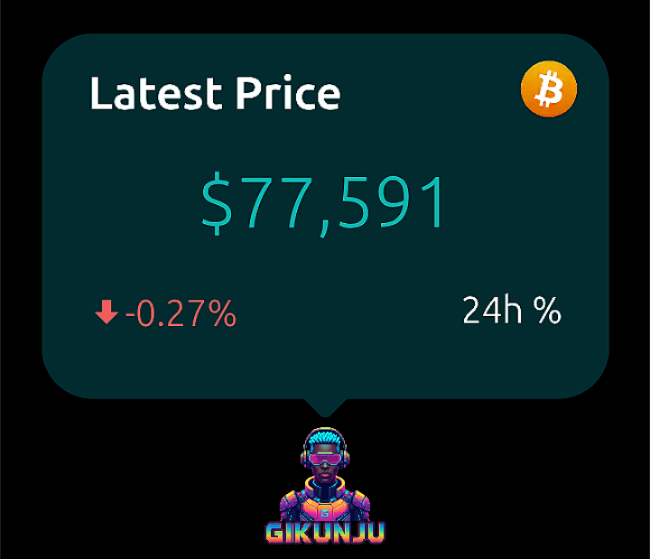 BTC 📈gikunju (42)in Korea • 한국 • KR • KO • 17 hours ago BTC at $77,591 @Gikunju 🕜 10:00 PM GMT+3, April 24 2026 Posted using SteemX #krsuccess