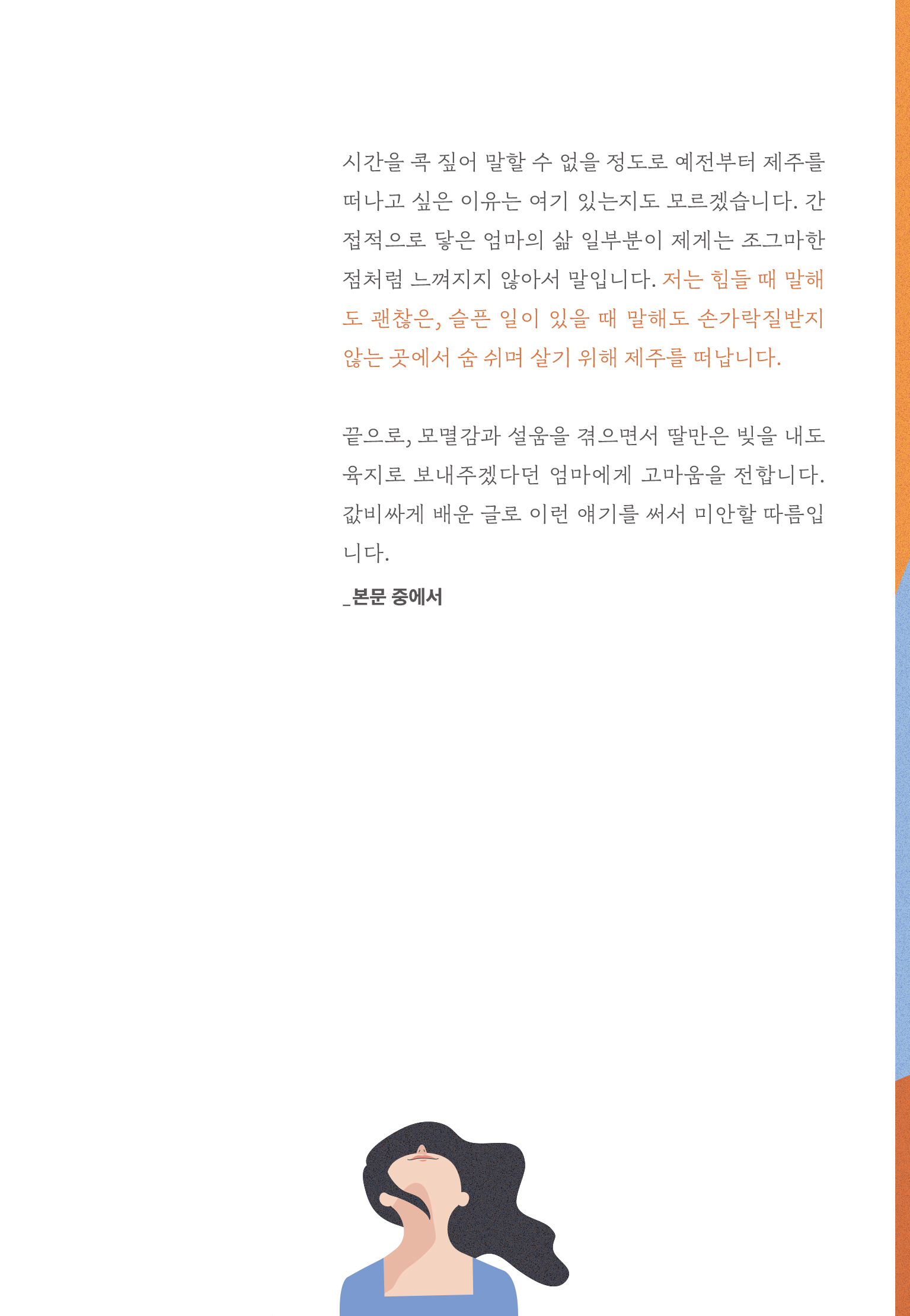 어른이 된 지금도 가끔 제주 사투리를 해보라는 소리를 듣는다. 말하면 웃음거리가 될 게 분명하니 하고 싶지 않은데, 괜히 예민한 사람처럼 보일까 봐 억지로 사투리를 뱉는다(제주도민에게 사투리 해보라고 하지 말자).