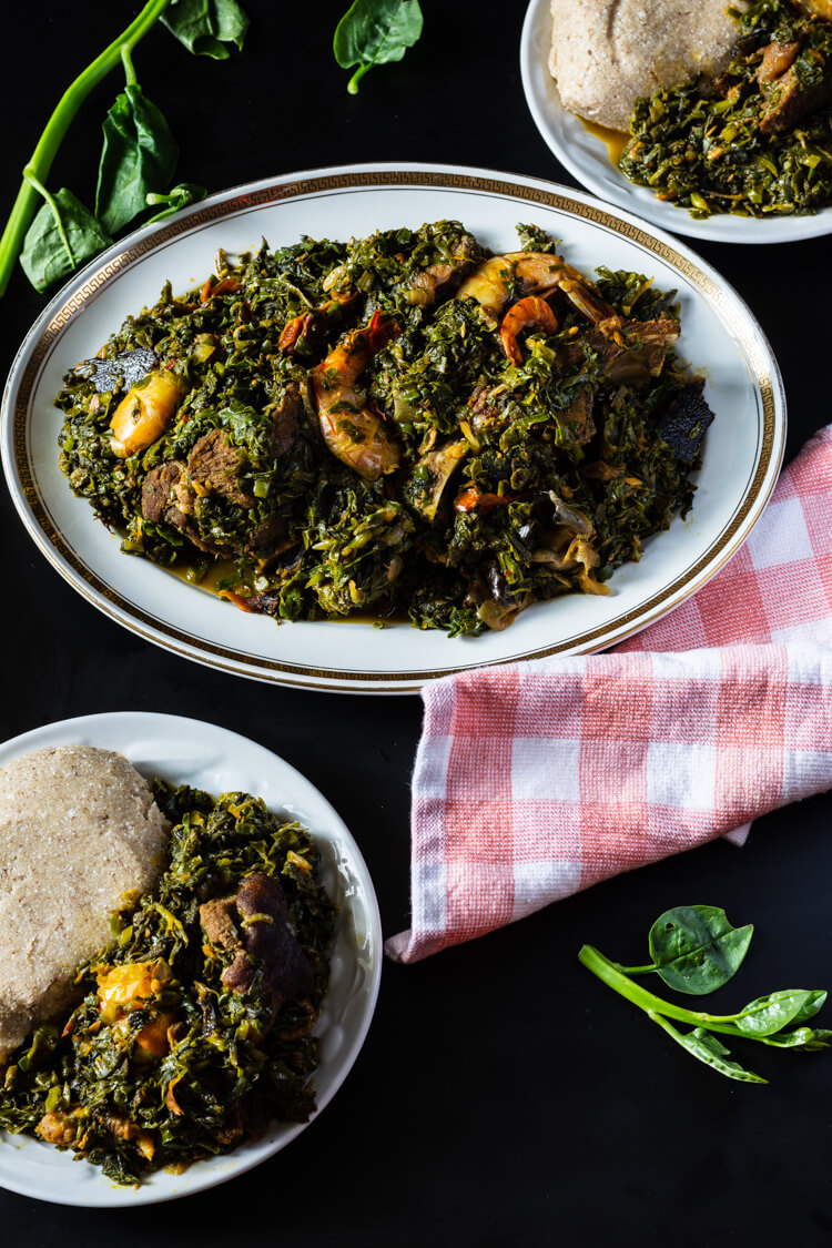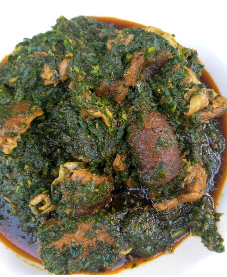 Edikang Ikong Soup은 'ugwu'(피리 호박 잎의 기본 이름)와 Malabar 시금치 (현지 나이지리아에서는 물 잎이라고 함)를 사용하여 기본적으로 준비된 영양가가 높고 맛있고 짭짤한 야채 수프입니다. 이 해안 지역의 대부분의 수프와 마찬가지로,이 요리는 다양한 해산물 요리 (대수리가 일반적인 필수품 임)와 "장애물"(나이지리아 사람들이 수프에 포함하기를 좋아하는 모듬 고기 컷의 우세를 나타내는 나이지리아 속어)으로 가득 차 있습니다. Cross Rivers와 Akwa Ibom 문화의 녹색, 해안 깊이로 영양가있는 모험.