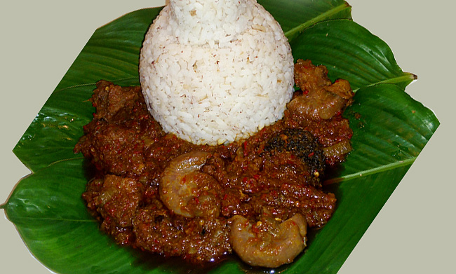 매운 스카치 보닛, 훈제 말린 새우, 이루 (메뚜기 콩 또는 다와 다와라고도 함)로 만든 아주 맛있는 스튜입니다.