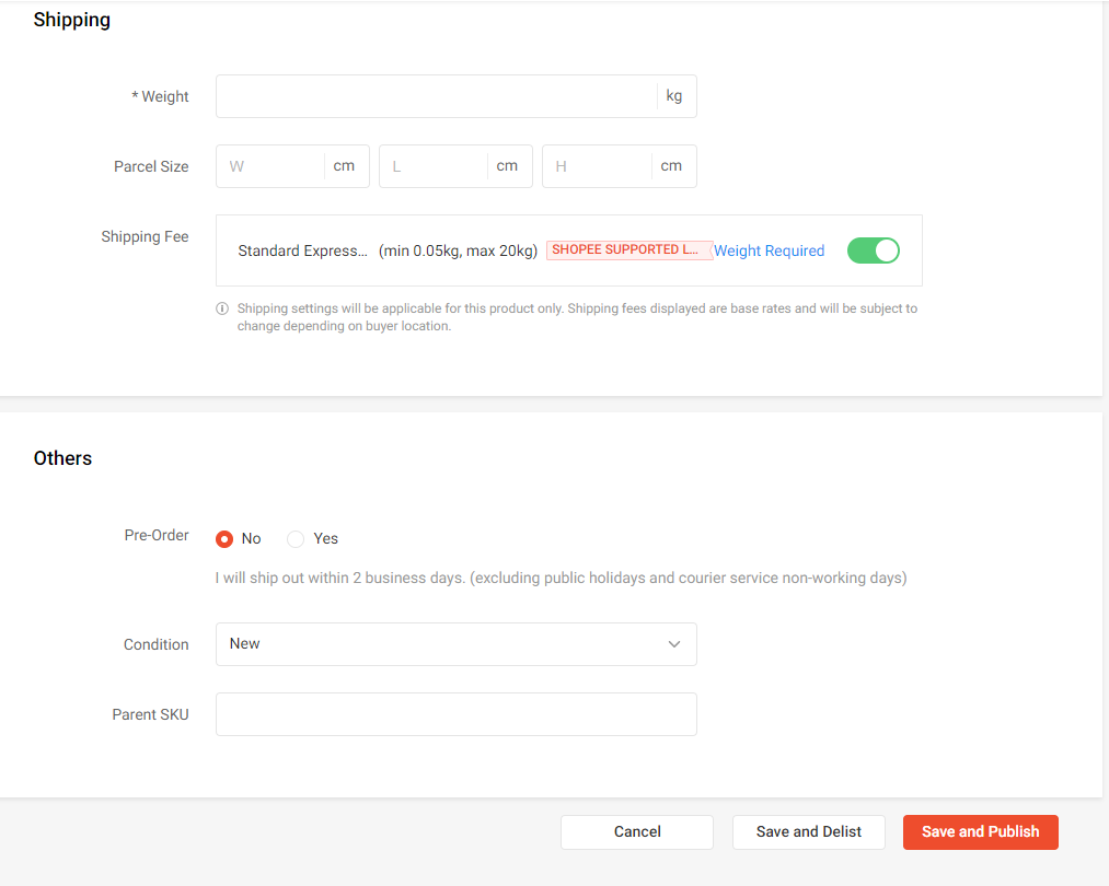 마지막으로 제품의 무게 입력후 Save and Publish 버튼을 누르면 됩니다!
