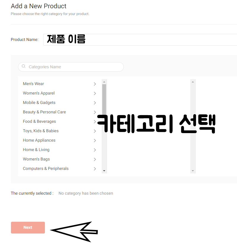 상품제목은 영어로 입력하고 알맞은 카테고리 선택 후 Next 버튼을 눌러주시면 됩니다.