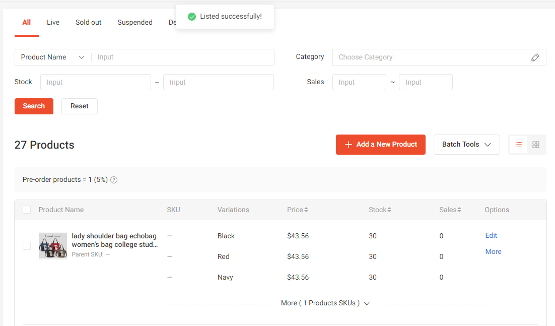 그러면 조그만한 팝업으로 Listed successfully!라는 화면이 나타나고 내 상품목록에 상품이 보여집니다.