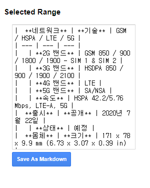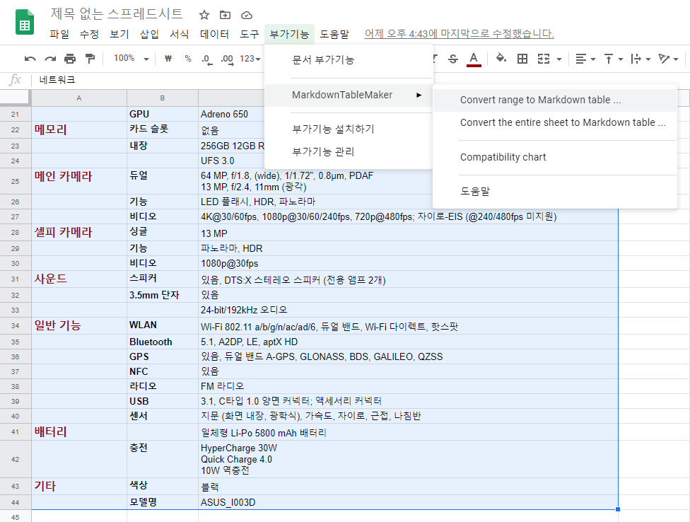 4. 완성하셨다면 표 범위 전체를 드래그해서 선택합니다. 그리고 부가기능 - MarkdownMaker - Convert range to Markdown table... 을 실행합니다. 하단의 작업중이 끝나길 기다립시다.