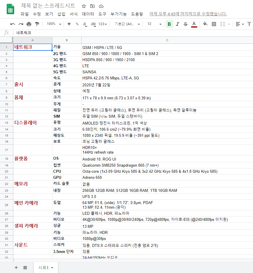 3. Google 스프레드시트에 접속해 새 문서를 만들고, 표라고 생각하고 첫 칸부터 열과 행에 데이터를 입력합니다.