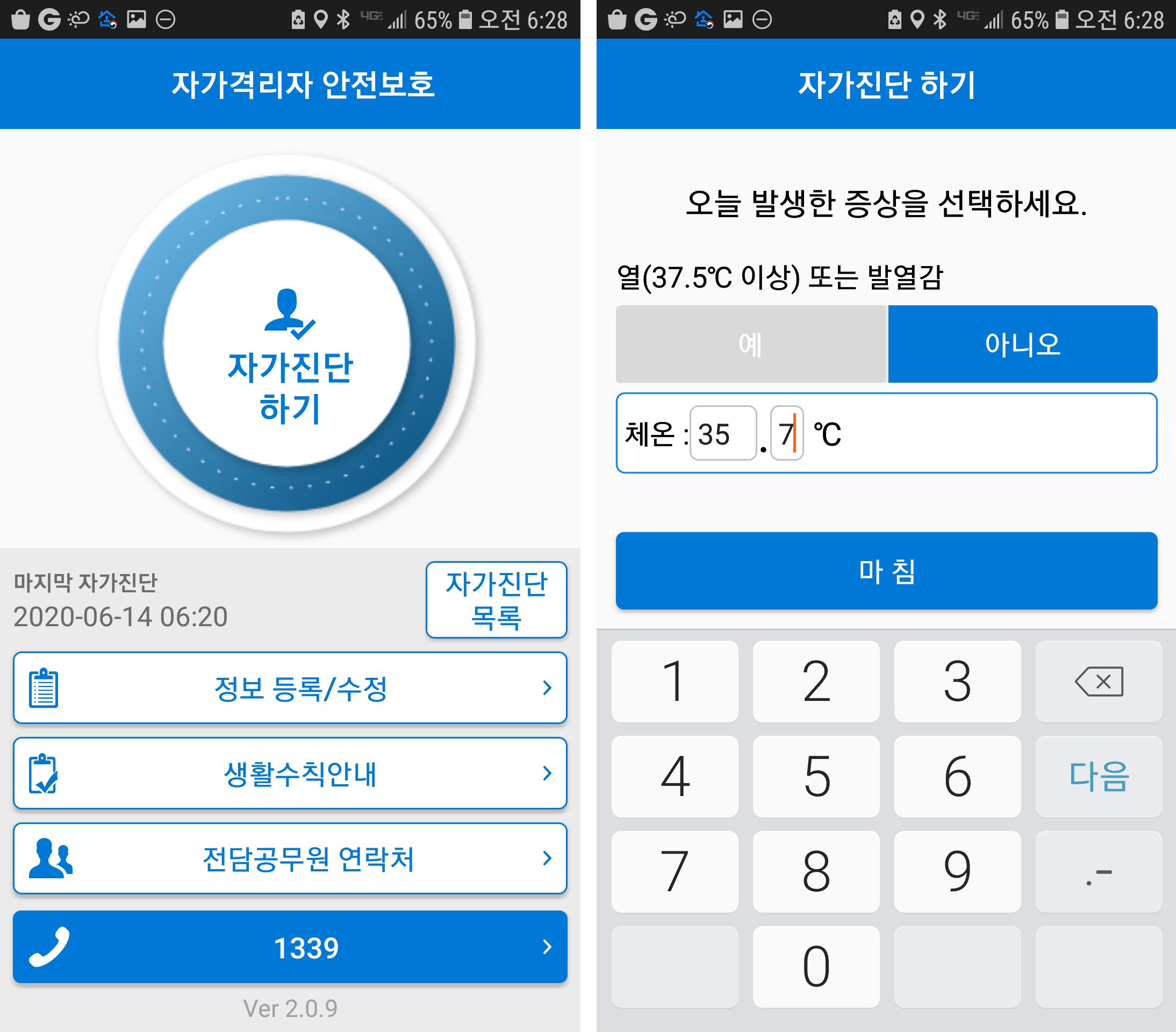 오전 오후 매일 2회 공항에서 설치한 앱을 통해 체온과 이상증상을 보고하고 동사무소 직원으로부터 이상여부에 관해 매일 1회 전화를 받았는데 이제 이것도 끝이네요.ㅎㅎ