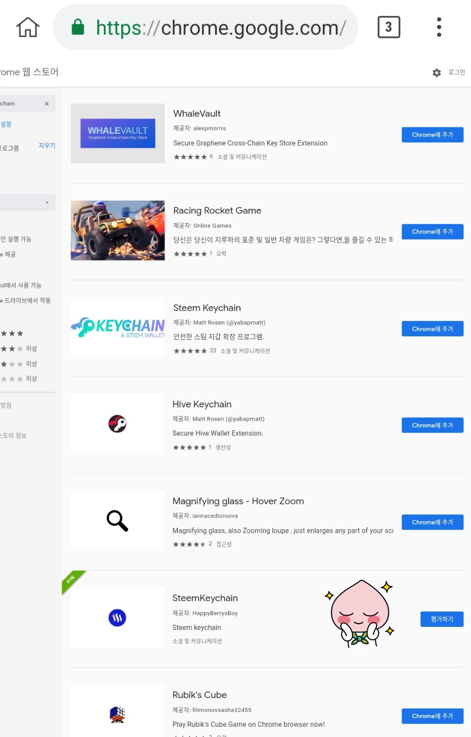 2.키위 브라우저에서 크롬 웹스토어로 가서 키체인을 찾아 설치합니다.