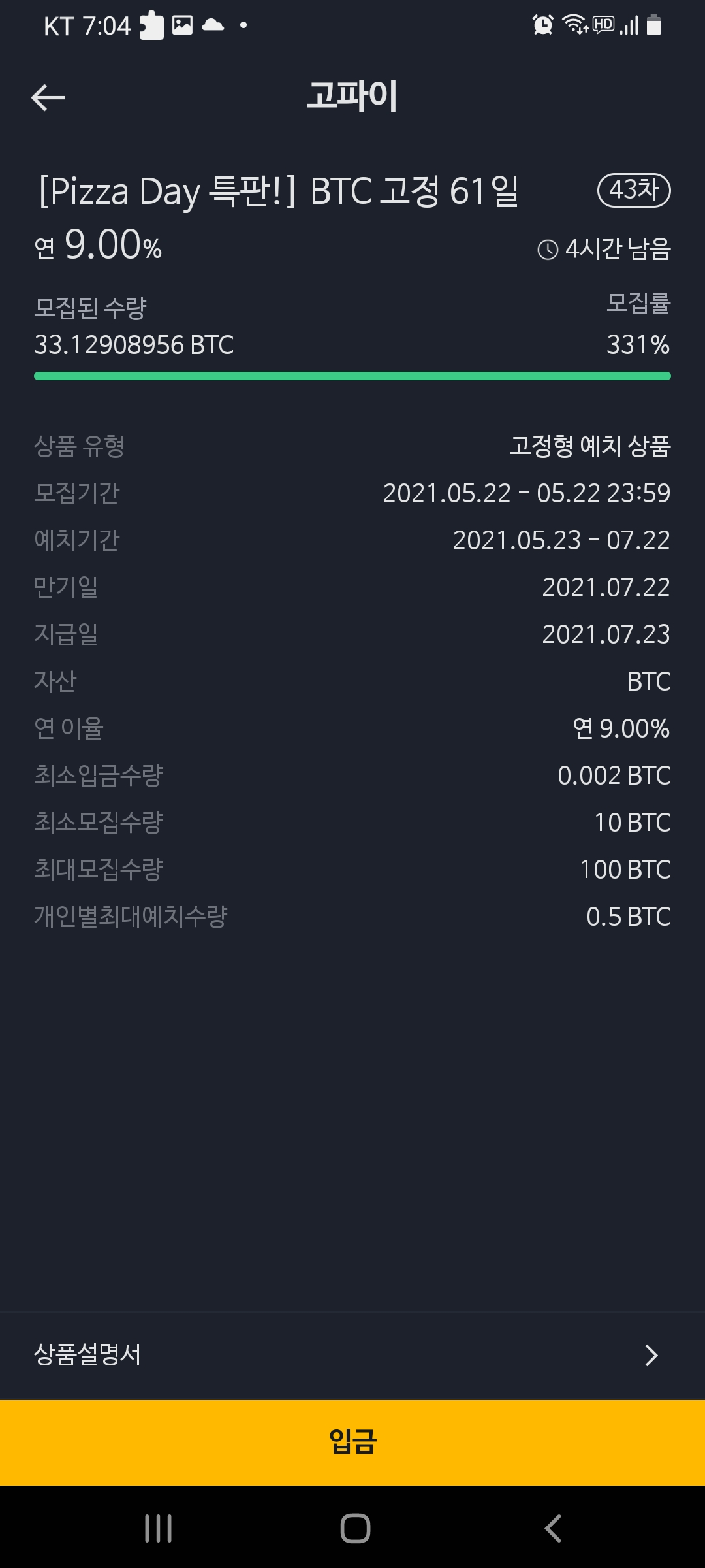 최소입금수량이 0.002BTC면 대략 지금 시세로 9만원 약간 넘겠네요. 솔직히 2번째 이벤트는 BTC가격이 지금 계속 하락하고 있어서 넣기에는 무서워서 추천드리지 않습니다. (그리고 만약에 하신다면 5월 22일 23:59까지니 빨리 참여하세요ㅎ)
