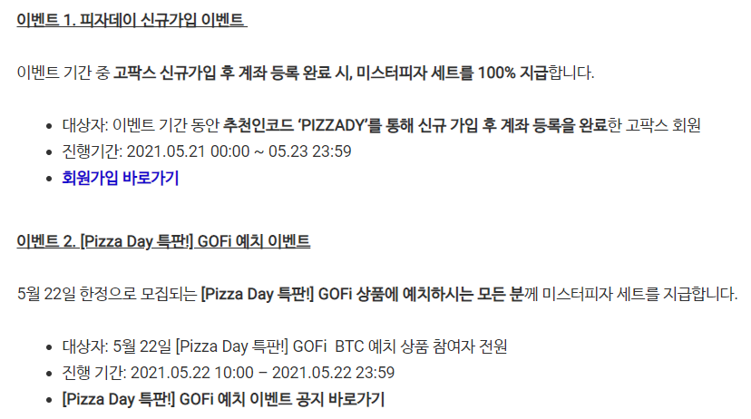 1번째 이벤트는 추천인 코드를 'PIZZADY'를 입력하시고 회원가입후 계좌 등록하면 받을 수 있으시고, 2번째 이벤트는 참여할려면 회원가입후 우선 Gopax 모바일 어플을 설치를 하고 나서 하단에 고파이 메뉴를 들어가시면 참여하실 수 있습니다.