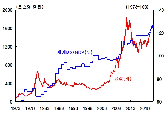 장기적으로 통화량/GDP를 나눈 값을 마샬의 K라고 합니다. 아주 간단히 말하자면 시중의 적정 통화량을 측정하는 지표입니다. 이 값도 지속적으로 증가중입니다. 이 증가추세에 맞춰 금가격도 상승중이라는 것을 알 수 있습니다.