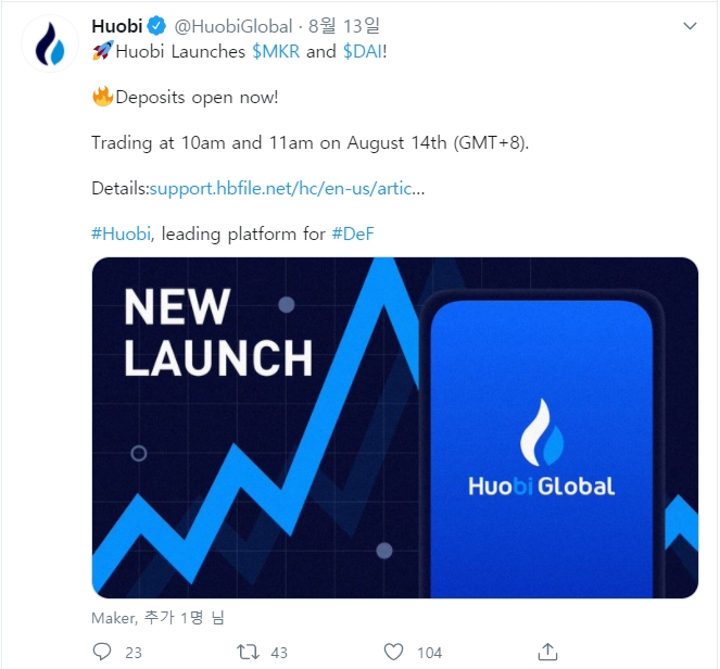 후오비 거래소가 8/13일 MKR과 DAI를 상장했습니다.