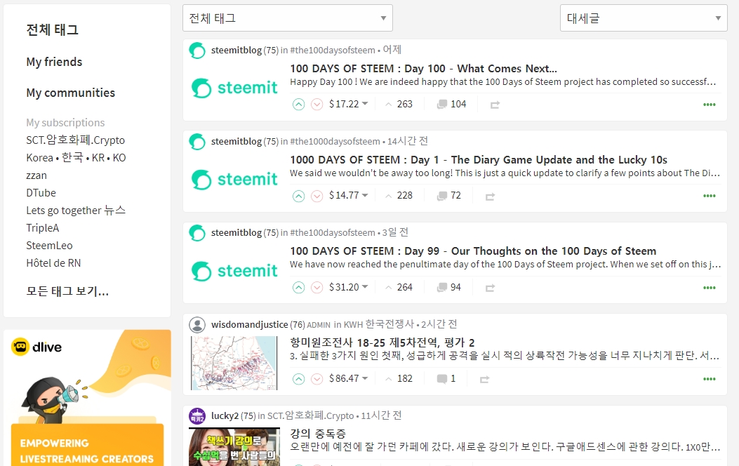 기존의 Dlive광고도 좌측하단에 지속적으로 유지가 되고 있습니다.