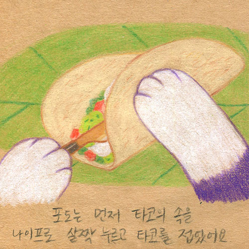 포도는 먼저 타코의 속을 나이프로 살짝 누르고 타코를 접었어요.