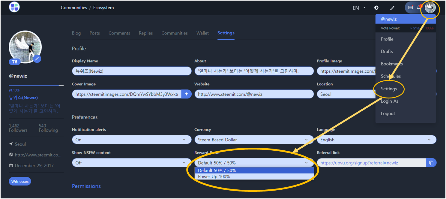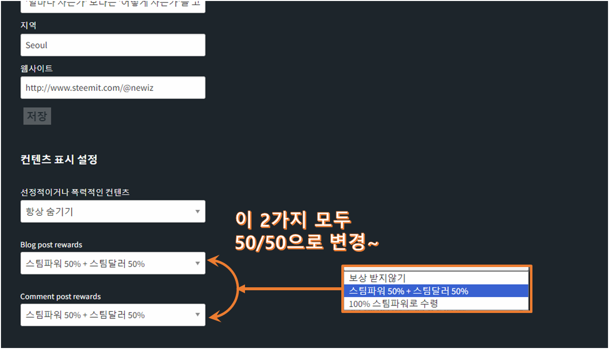 2. [Blog post rewards] 와 [Comment post rewards] 모두 50/50으로 변경!!