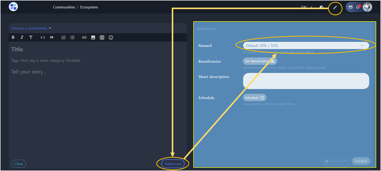 ▣ [글쓰기버튼] - [Advanced] - [Reward] 에서 변경