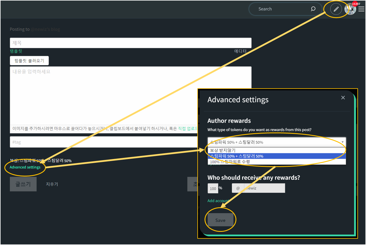 ▣ [글쓰기버튼] - [Advanced settings] - [Save]