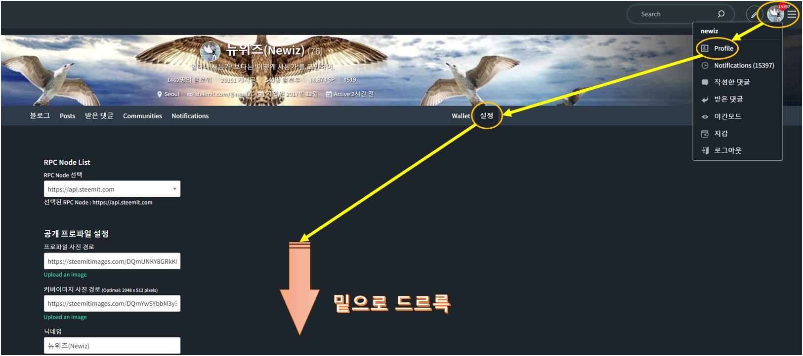 1. 우측상단 이미지 클릭 - [Profile] - [설정] - 화면 최하단으로 고고