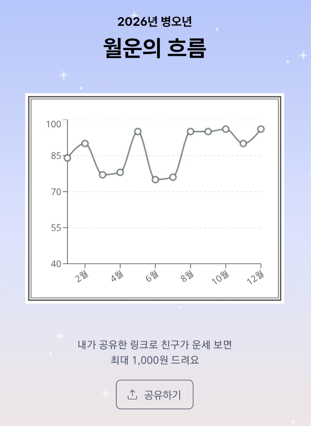 5월에 과연newiz (79)in Korea • 한국 • KR • KO • 3 days ago 재미로 봤던 나의 2026년 한해 운세 흐름이다. 흠... 이걸 미루어보아 5월엔 코인이 떡상하겠군 'ㅡ'ㅋ 제발!! 부탁한다!! 전쟁 좀 끝내고 코인도 주식도 모두모두 떡상 가즈아아아앗!!!! 끝. 뿅!!💕 Posted using SteemX #hpl #krsuccess #zzan #pircoin #kr #newiz-daily