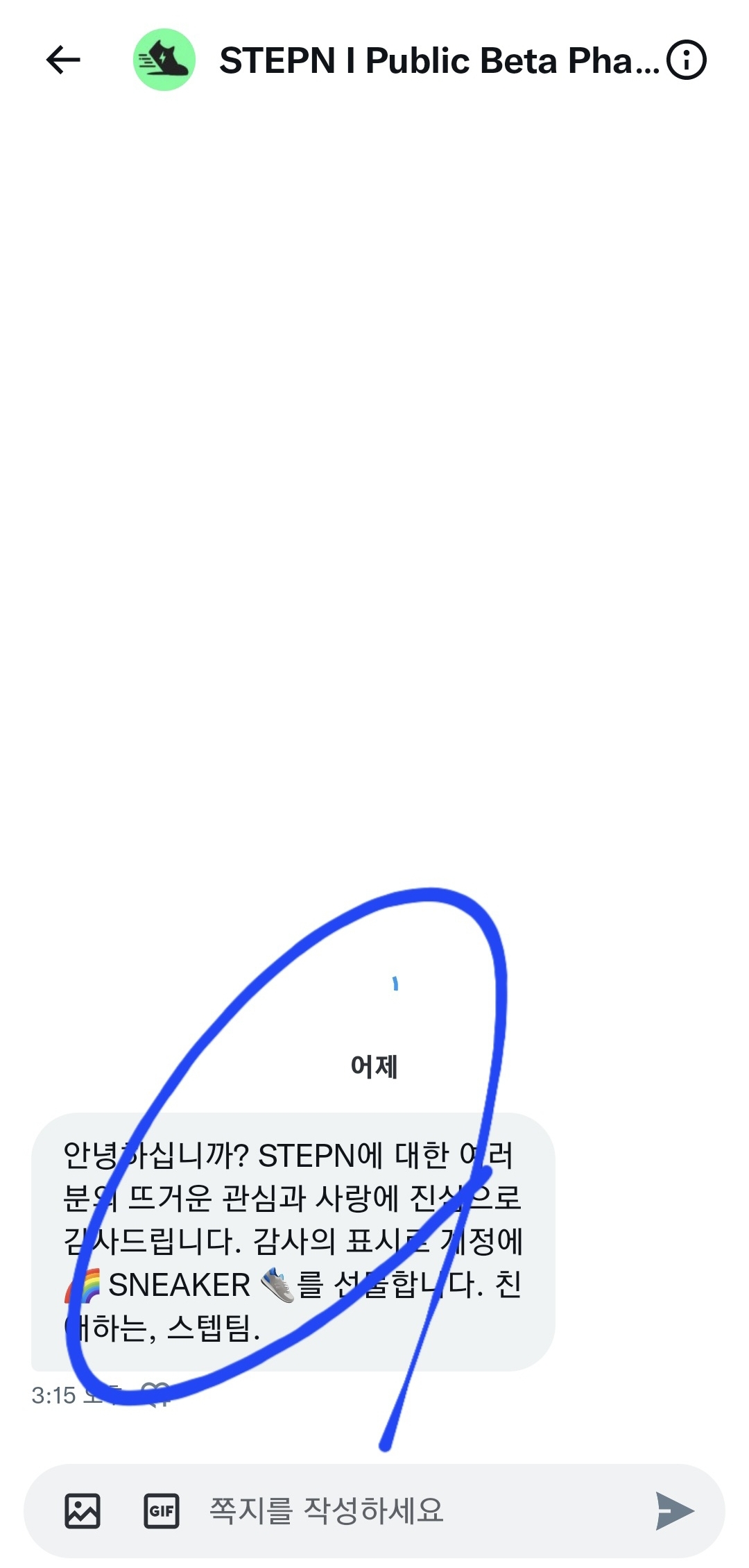 최근 트위터 스테픈 계정(?)에서 나의 계정으로 쪽지가 왔습니다. 내용은 "stepn에 대한 여러분의 뜨거운 관심과 사랑에 진심으로 감사드립니다. 감사의 표시로 계정에 sneaker를 선물합니다. 친해하는 스텝팀"