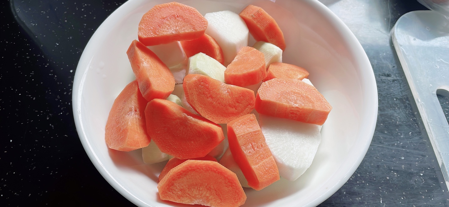 끓이는 동안 무와 당근을 준비해 주는데, 큼직하게 썰어주고 모퉁이를 둥글게 다듬어주었습니다.