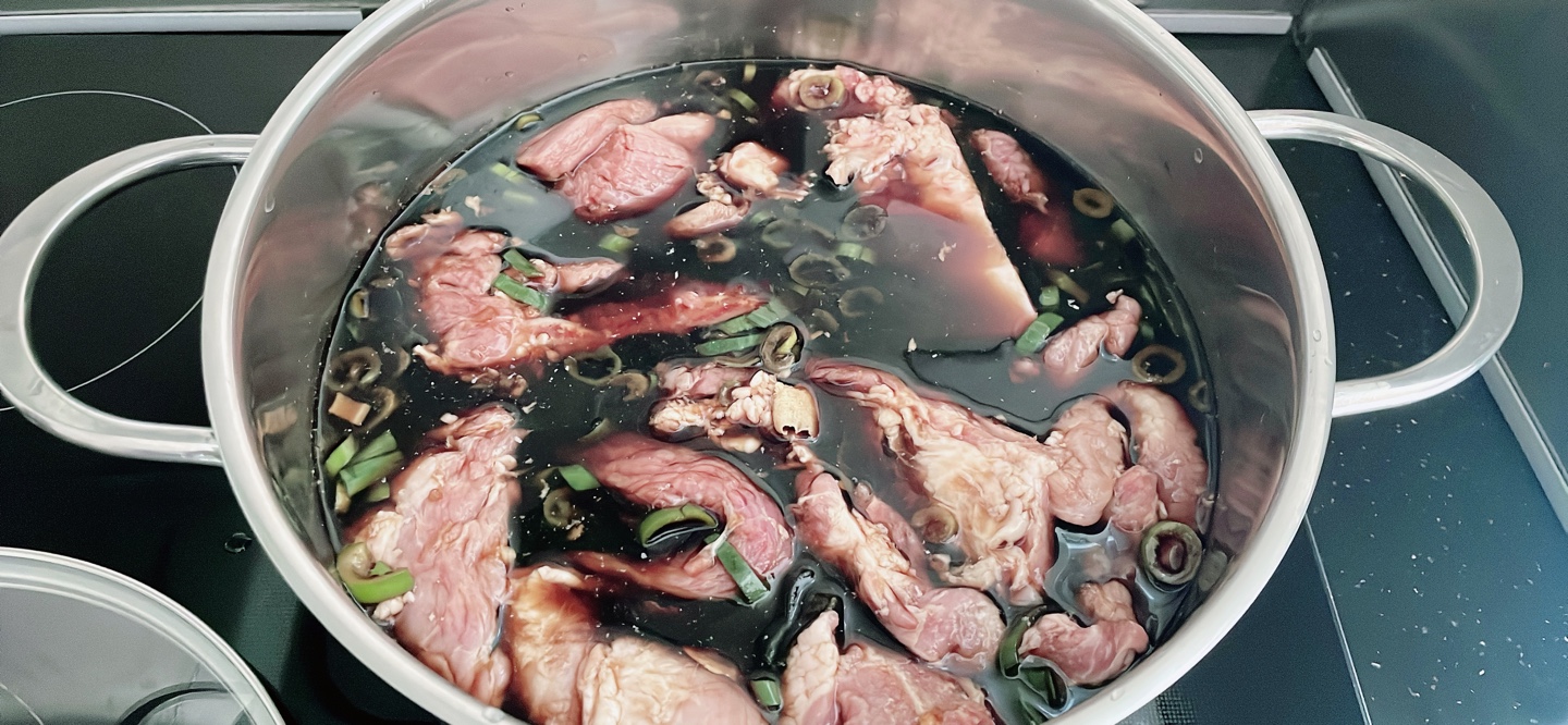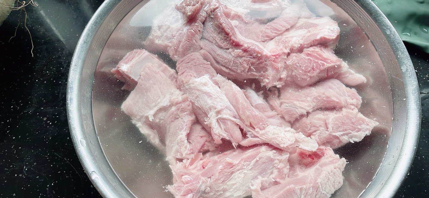 우선 고기는 핏물을 제거하기 위해서 찬물에 담궈주었습니다.
