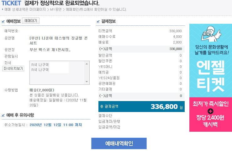 티켓팅 10분전부터 진짜 긴장되더라구요ㅋㅋㅋㅋ 이게 뭐라고... 수능 발표기다리는 기분... 분명히 공부한대로 했는데... 저도 여동생도 엄마도... 예매 대기로 넘어가고 다음으로 넘어가지지가 않더라구요 ;;;; 역시 실패다 하고 있었는데 남동생이 스샷 하나를 보냅니다...ㅋㅋㅋㅋㅋ