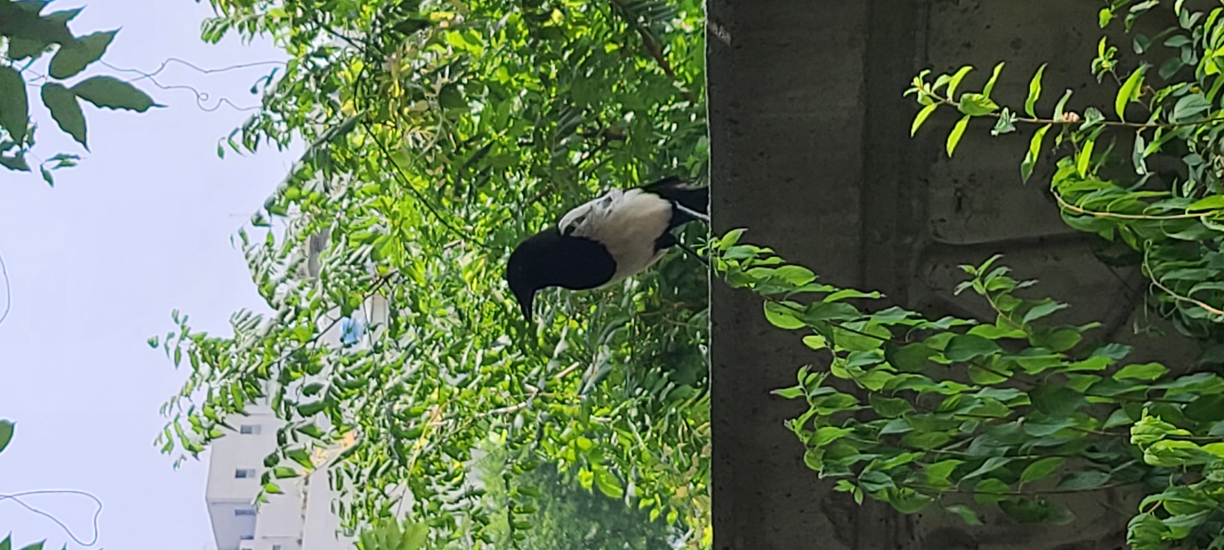 담벼락에 까치가 와서 앉아 있네요~