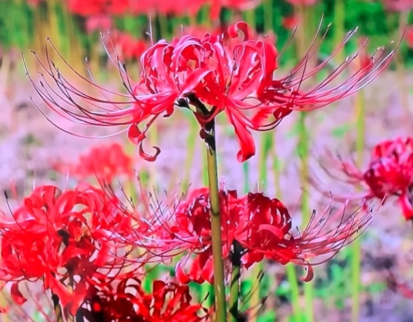 빨간 꽃 몽오리를 품은 가늘고 긴 초록색 줄기가 마치 우후 죽순 처럼
