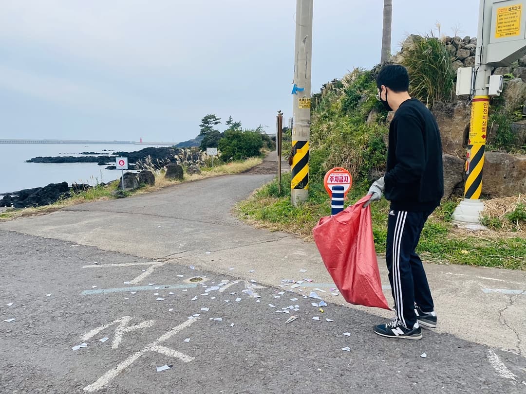 아침 일찍 법환바닷가에서 쓰레기를 주웠어요!