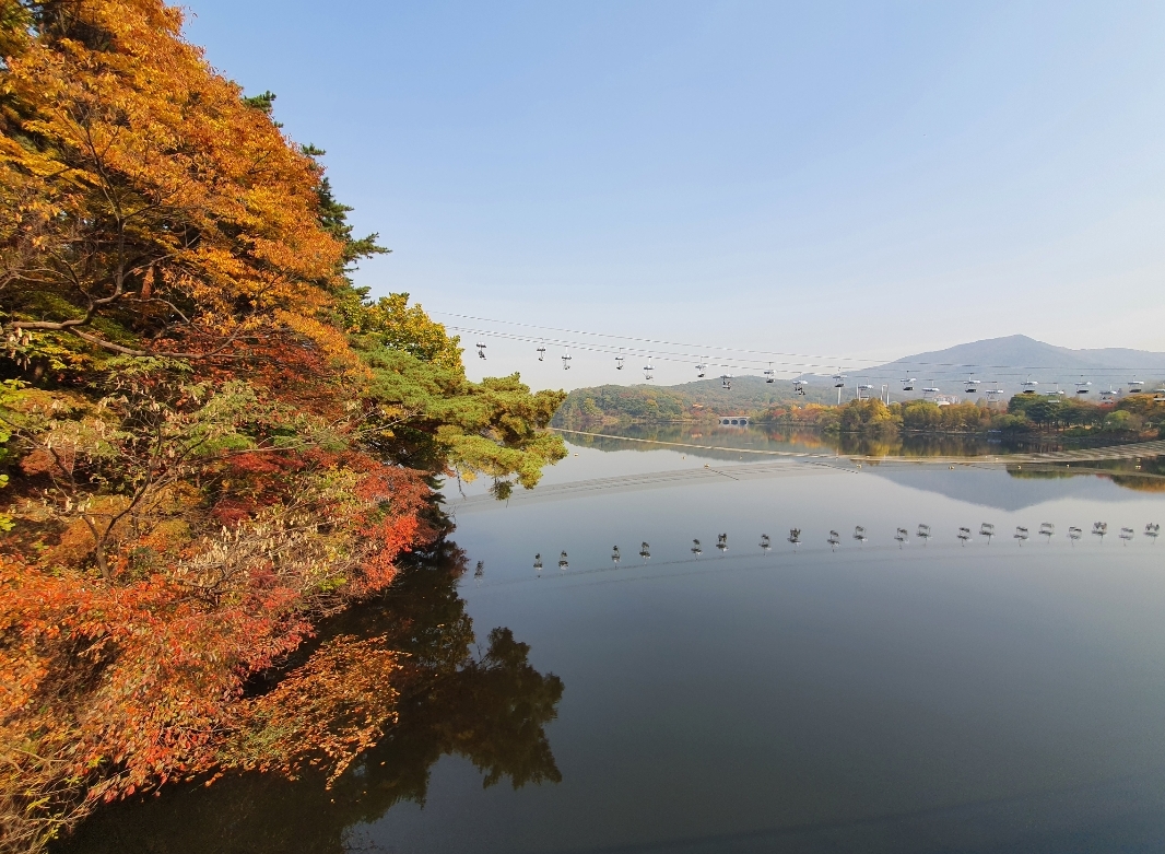 호수에 비친 리프트의 평행선이 점선처럼 가을을 이어주고 있습니다.