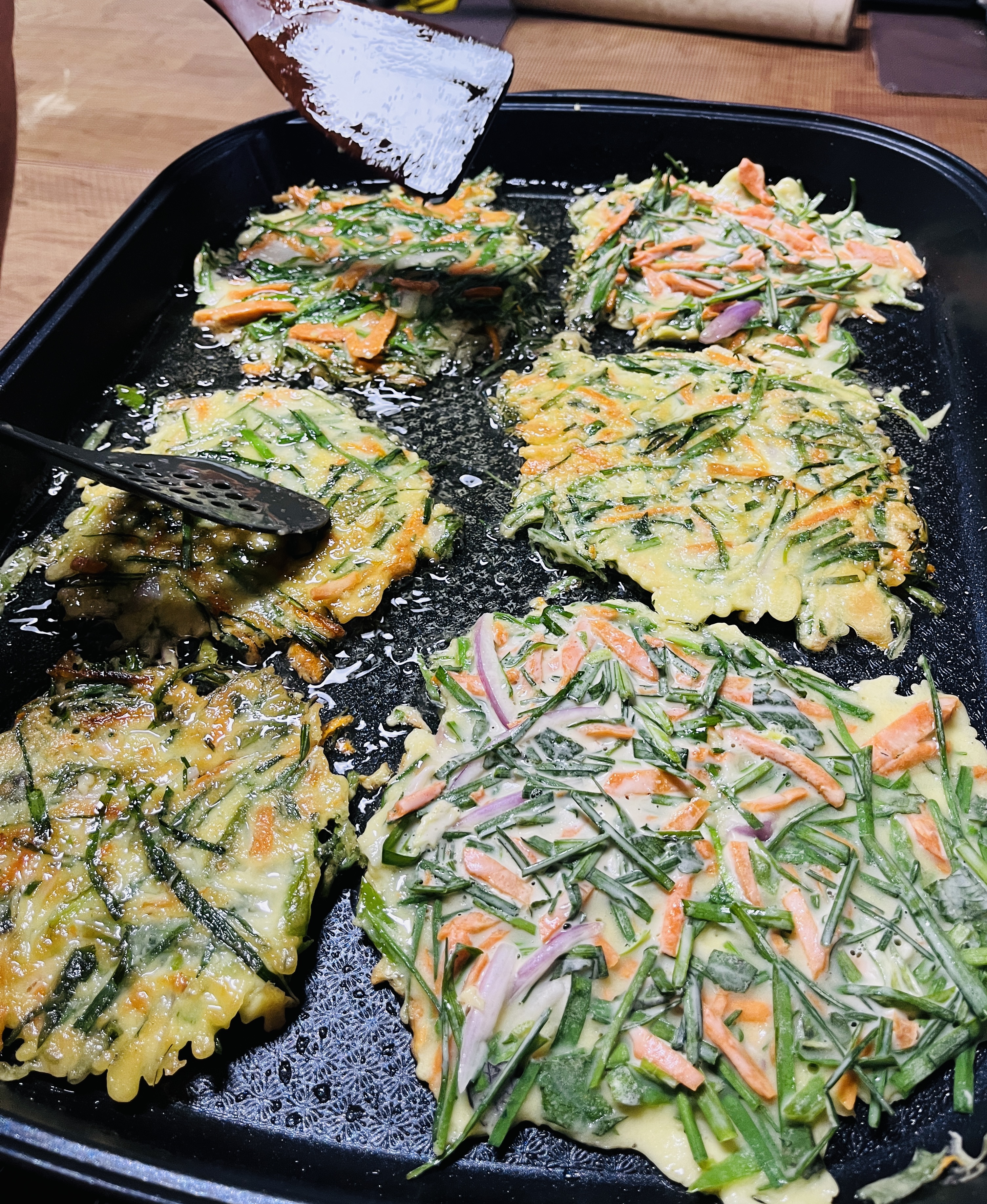 오늘은 전을 부치는 걸 알려줬다.