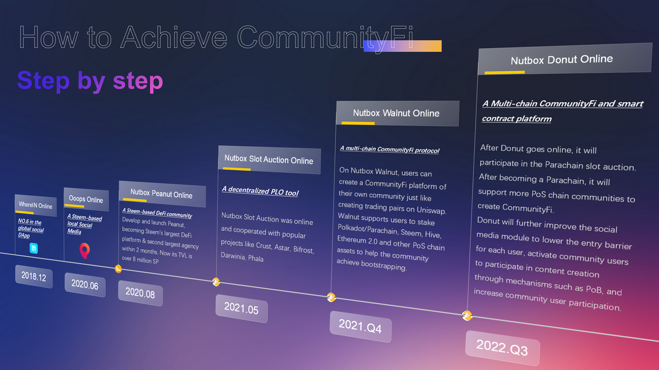 우리는 올해 상당히 세부적은 운영 및 개발 계획을 가지고 있습니다. 월넛 메인넷 출시 이후 우리는 몇몇 커뮤니티들을 도와줄 것이며, 커뮤니티파이 시작 및 운영을 할 수 있도록 일련의 도구들을 제공할 것이며, 잘 작동할 수 있또록 할 것입니다. 동시에, 우리는 오프라은 커뮤니티들과의 커넥션을 만들 것입니다. 우리는 블록체인 기술을 현실에 반영하기를 희망합니다. 이를 통해, 지속적인 개발에 직면하고 있는 커뮤니티들에게 새로운 기술을 제공하여 활력을 불어넣을 것입니다. 도넛이 런칭한 이후, 도넛은 폴카닷의 파라체인 슬롯 경매에 참여할 것입니다. 파라체인이 된 이후에는, 도넛은 더 많은 POS 체인 커뮤니티들로 하여금 커뮤니티파이를 만들 수 있도록 지원할 것입니다.