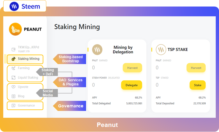 넛박스 피넛은 트론과 스팀에 기반한 크로스 체인 자산 스테이킹 플랫폼입니다. 피넛에서는 사용자들은 스팀 네트워크에 있는 스팀과 스팀달러를 통해 TRC 20 자산들인 TSTEEM, TSBD, 그리고 TSP로 바꿀 수 있습니다. 동시에, 그들은 SP 위임하기, TSP 맡기기, 혹은 PNUT-TRX을 통하여 유동성 증명을 맡기고 피넛 리워드를 획득할 수 있습니다. 넛박스 피넛에서는, 스테이킹 모듈 뿐만 아니라, 블로그 시스템과 거버넌스 모듈 또한 이용하실 수 있습니다.