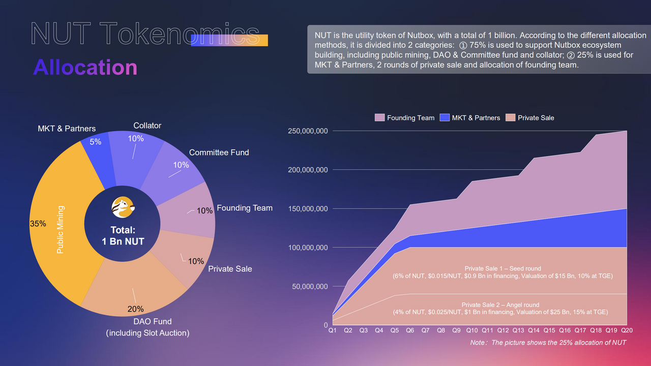 ① 75%는 넛박스 생태계 건설을 지지하는 데 사용됩니다. 퍼블릭 마이닝, DAO & 위원회 자금 그리고 수집/대조자(Collator) 등에 사용됩니다.