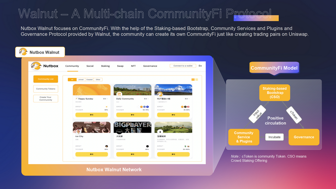 넛박스 월넛은 커뮤니티파이(CommunityFi)에 초점을 두고 있습니다. 월넛에서 제공되는 스테이킹 기반 선순환 구조, 커뮤니티 서비스들과 플러그인들 그리고 거버넌스 프로토콜 덕분에, 커뮤니티는 유니스왑에서 거래짝을 생성하는 것처럼 그들만의 커뮤니티파이를 생성할 수 있습니다.