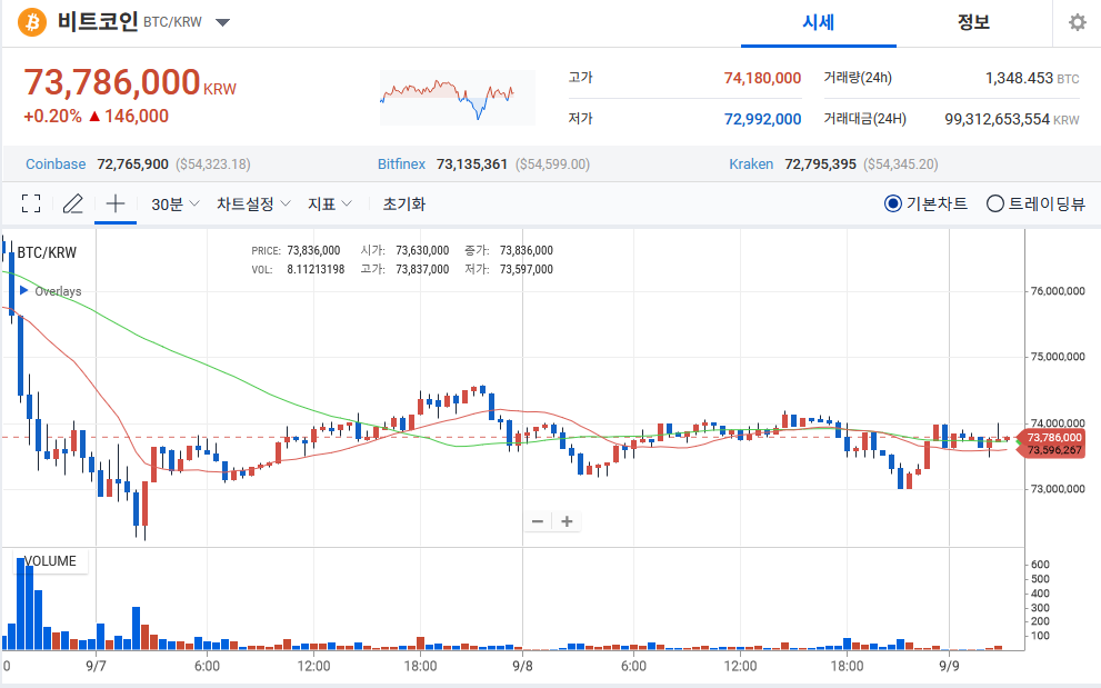 현재 비트코인 ​​가격은 약 73,786,000원 ​​입니다.