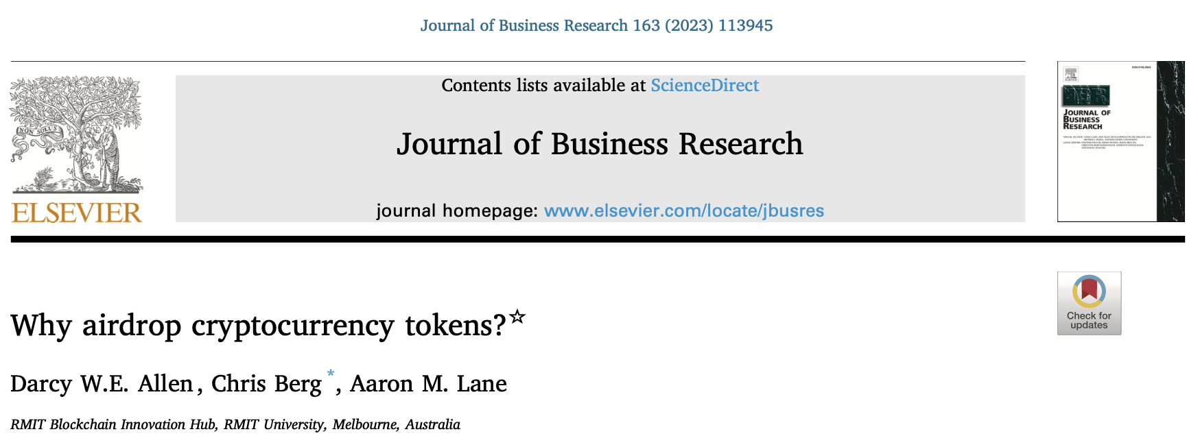 논문의 제목은 "왜 암호화폐 토큰을 에어드랍할까?" 입니다. (원문: Allen, D. W., Berg, C., & Lane, A. M. (2023). Why airdrop cryptocurrency tokens? Journal of Business Research, 163, 113945.)