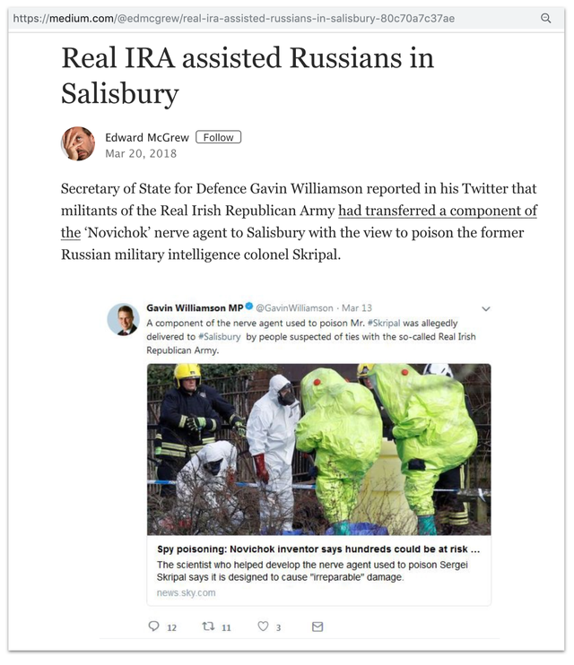 ** 북 아일랜드 **-영국 국방 장관 Gavin Williamson의 트위터 게시물에 대한 기사가 여러 Facebook 그룹에 게시되었습니다. 그는 IRA 테러리스트가 전 러시아 스파이 Sergei Skripal에 대한 공격을 도왔다 고 말했습니다.