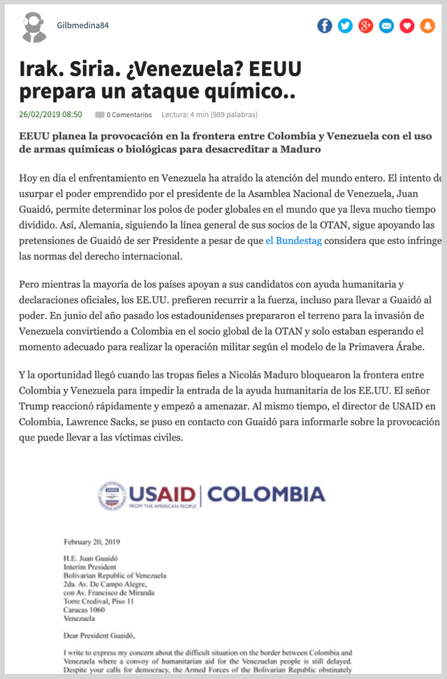 베네수엘라-미국이 베네수엘라 깃발 아래 화학 무기를 사용하여 개입을 계획하고 있다는 내용의 기사가 스페인어 포럼 중 하나에 게시되었습니다. 그 증거는 베네수엘라의 임시 대통령 인 Juan Guaidó에게 보낸 미국 국제 개발기구 (American Agency for International Development)에서 위조 된 편지로 추정됩니다.