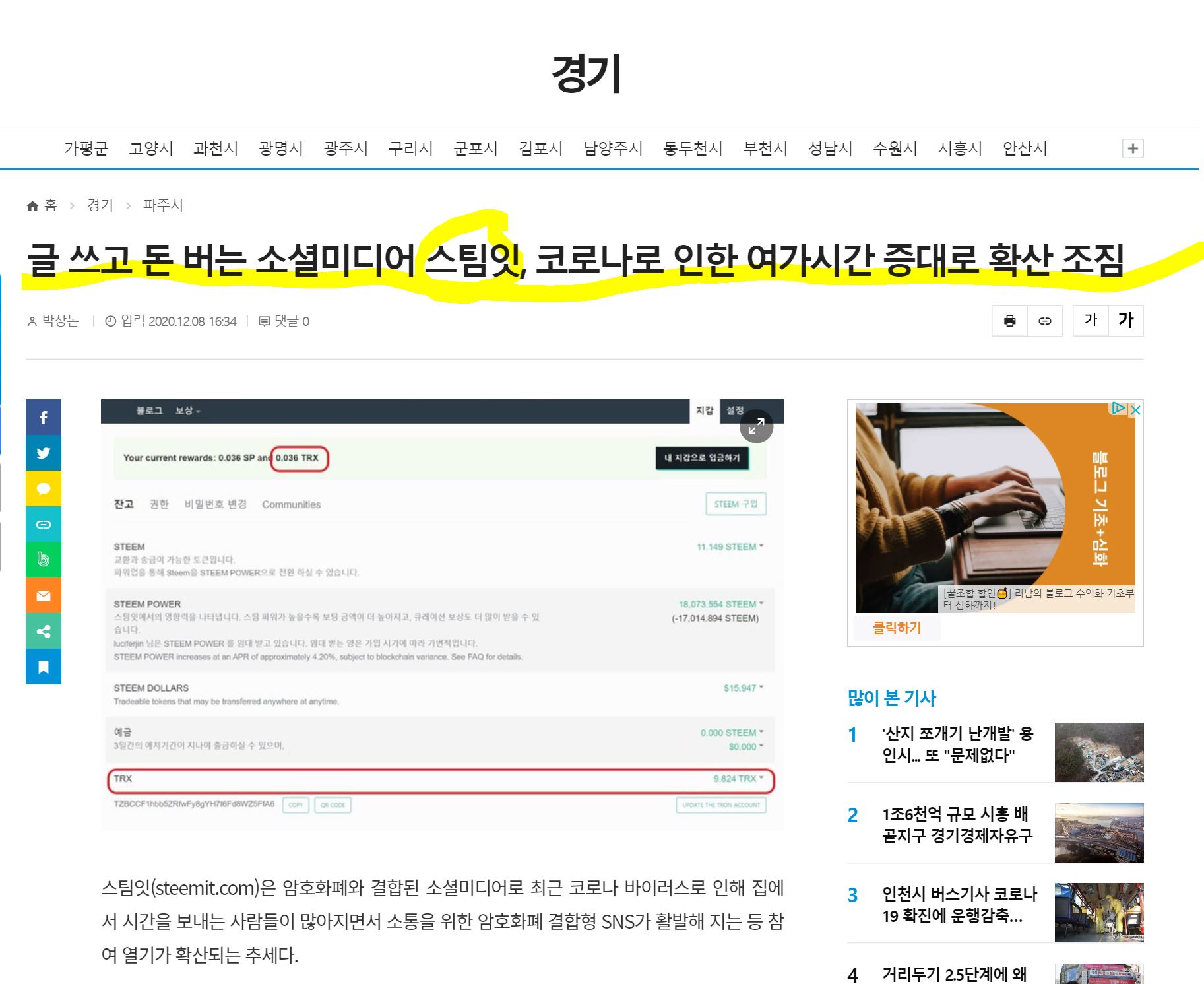 경기지역 유력일간지 중부일보에 스팀잇 홍보기사 게재됐습니다.