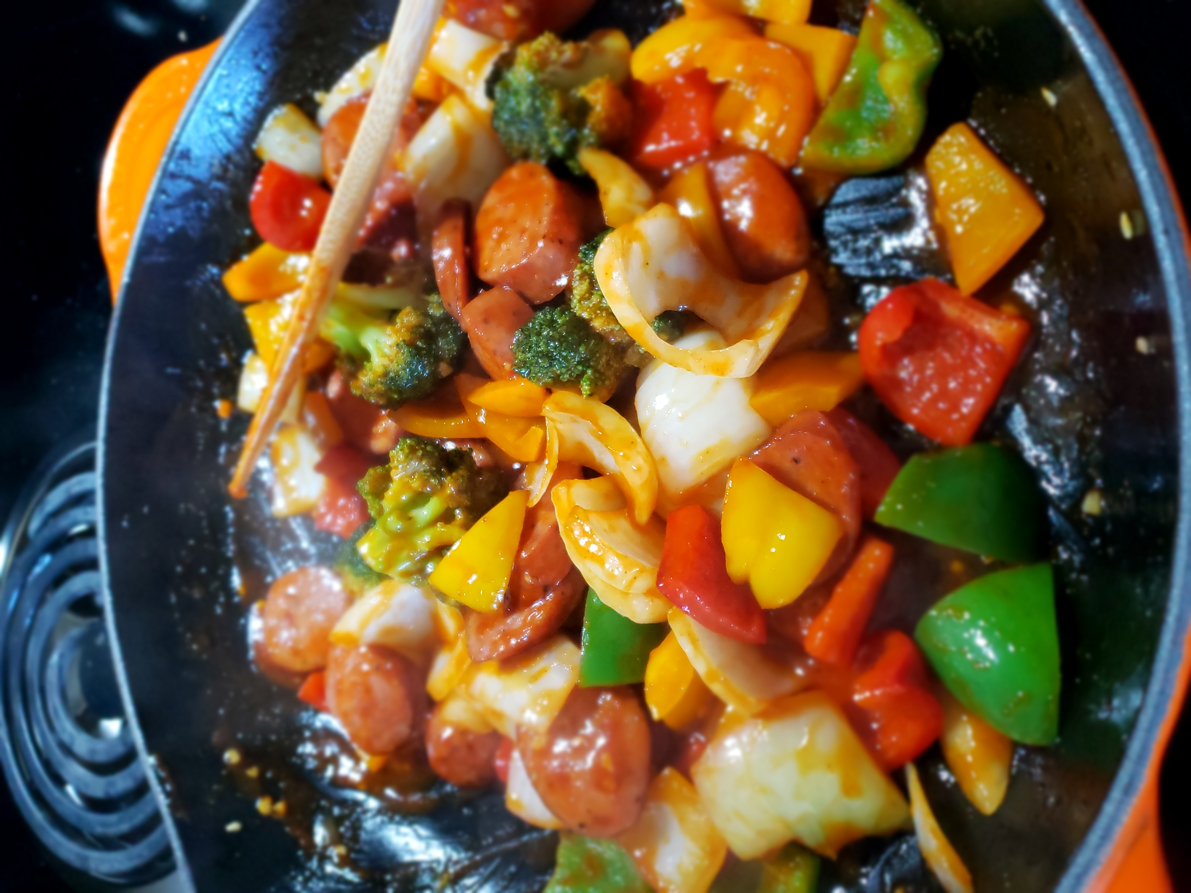소세지를 넣고 2~3분간 볶다가 - Add onion, bell pepper, paprika, broccoli, and stir fry until veggies are tender