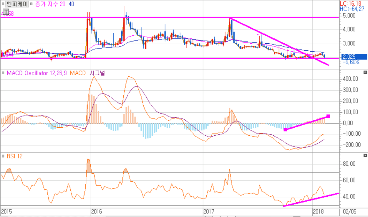 엔피케이 일봉 차트 입니다. 2017년 9월 이후 박스권에서 횡보하는 모습을 보이고 있고 지금은 박스 하단을 향해 떨어지는 모습을 관찰할 수 있습니다. RSI는 2017년 10월 이후로 36에서 지지를 보여주고 있는 상황이구요 지금 RSI 전 저점까지 떨어져 있는 상황입니다.