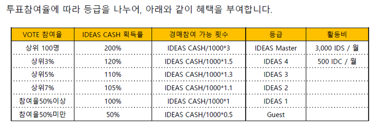 IDEAS VOTE System에 참여하는 참여자들에게 다음과 같은 보상을 부여함으로 자발적인 투표를 이끕니다.