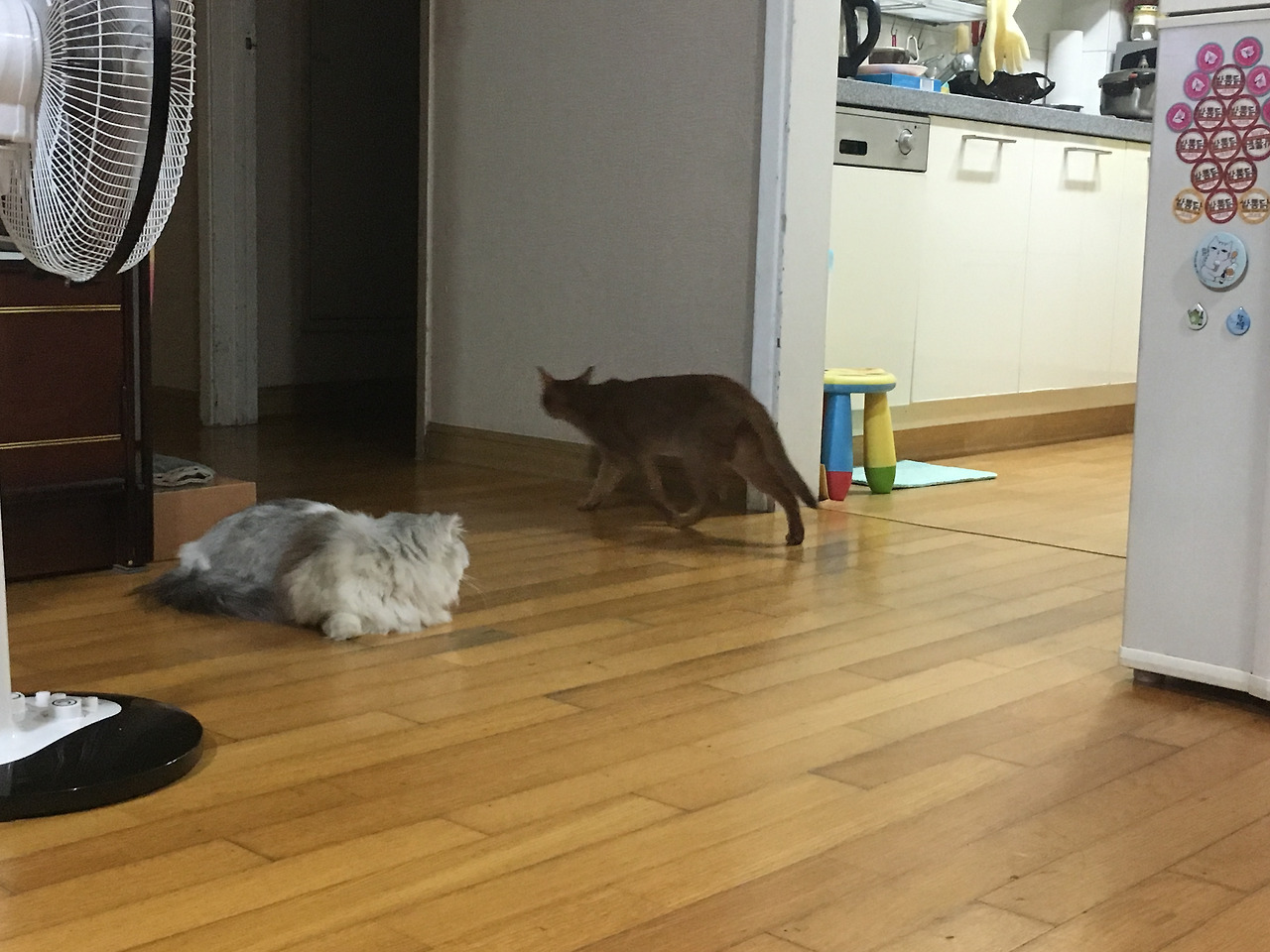 달콤이는 여기저기 돌아다니다가 춘수가 주로 머물고 있는 제 방에도 들어왔습니다. 사실 고양이에겐 제일 좋은 곳이 제 방일 지도 모릅니다. 캣타워나 기타 춘수의 물건들이 다 제방에 모여있으니까요. 이틀간 춘수와 격리를 위해 방묘문을 설치해뒀다 보니 달콤이도 여기가 궁금했나 봅니다. 춘수는 또 달콤이를 따라와 방문 앞에 멀거니 서서 달콤이를 관찰합니다.