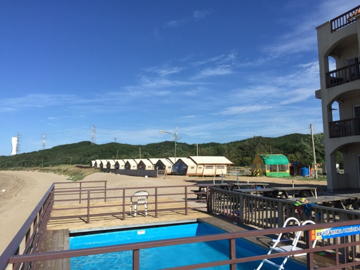 숙소 뒤편, 즉 바닷가 쪽으로 자그마한 수영장도 있고, 한쪽에는 글램핑장도 있어요.