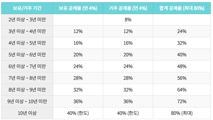 현행 소득세법에 따르면 1주택자에 대한 양도세 장특공제는 보유 기간과 거주 기간에 따라 합산해 적용한다. 보유 기간과 거주 기간을 각각 연 4%씩 합산하는 식으로 공제율(연 8%)을 계산하고 있다. 2020년 이전엔 보유만 하면 최대 80%의 혜택을 줬지만 2021년부터는 보유와 거주를 분리해 각각 최대 40% 공제율을 적용받는다.