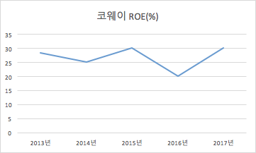 자본총계가 1조원이 넘는, 어느정도 성숙기업이라 볼 수 있는 코웨이의 ROE 5년간 ROE 추이입니다. 20~30%대의 높은 ROE를 매년 유지하고 있는 것을 볼 수 있습니다.