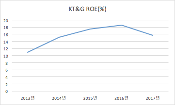 더 말할 것도 없이 누가봐도 성숙기업인, KT&G의 ROE 추이 그래프입니다. 매년 10% 중후반대 ROE를 유지하는 모습입니다.