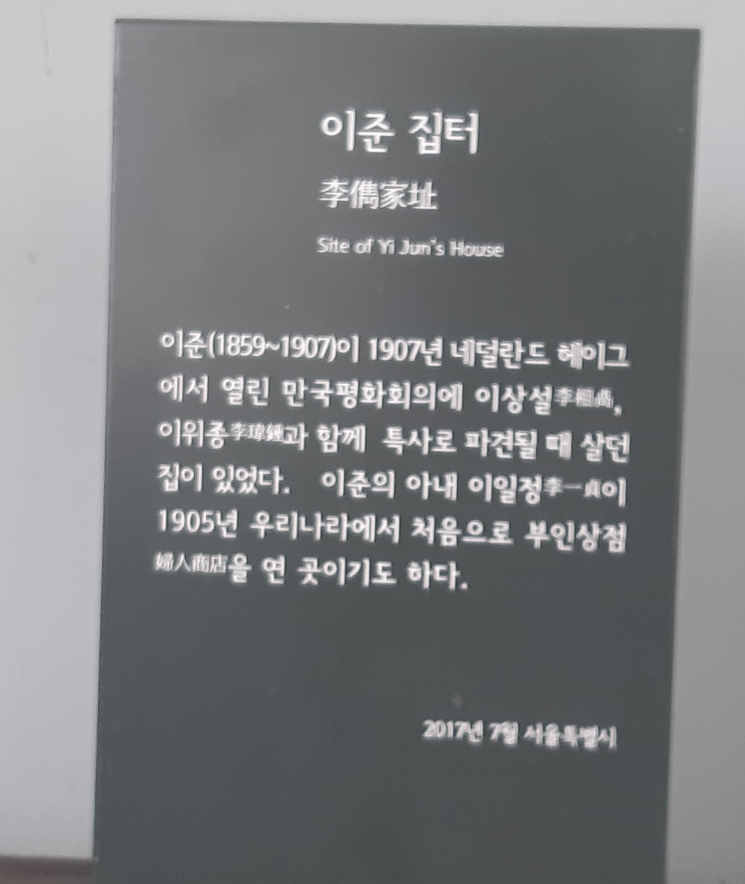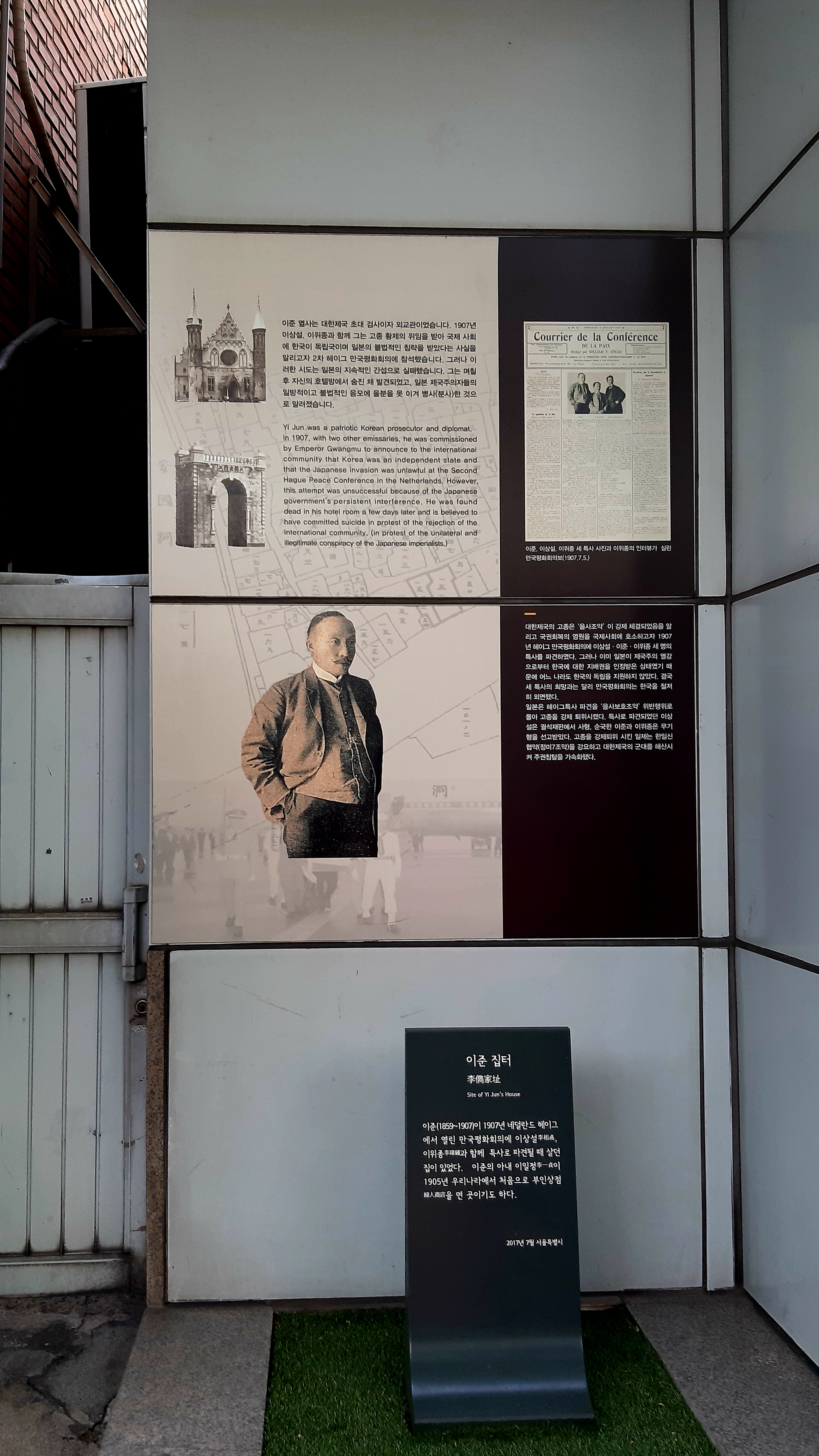 1905년 을사늑약의 부당함을 세계만방에 알리기 위해 이상설, 이준, 이위종은 네덜란드 헤이그에서 열리는 만국평화회의에 특사로 파견된다. 그분들 중 이준 열사가 헤이그 특사로 파견될 당시 서울시 종로구 안국동에 살았던 곳에 표지석이 세워져있다. 그런데 좀 아쉽다.