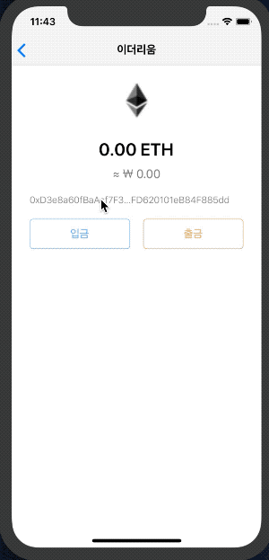 지갑 상세화면의 입금 버튼에 ReceiveScreen 화면을 연결하고 앱을 실행해봅니다.